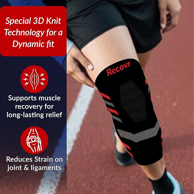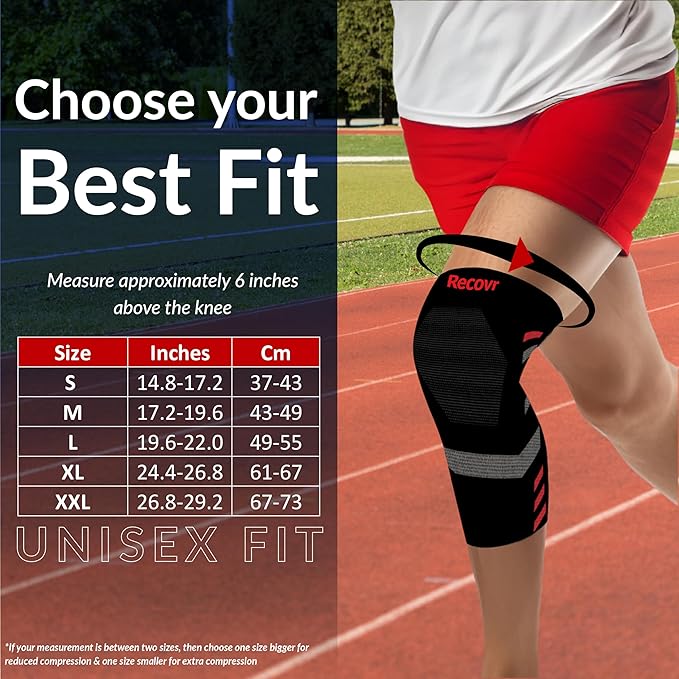 • Sporty Design in Multiple Sizes – Available in S, M, L, XL, and XXL sizes, Recovr knee support sleeves feature an elegant, sporty design suitable for men & women, making them a perfect choice for athletes & fitness enthusiasts.